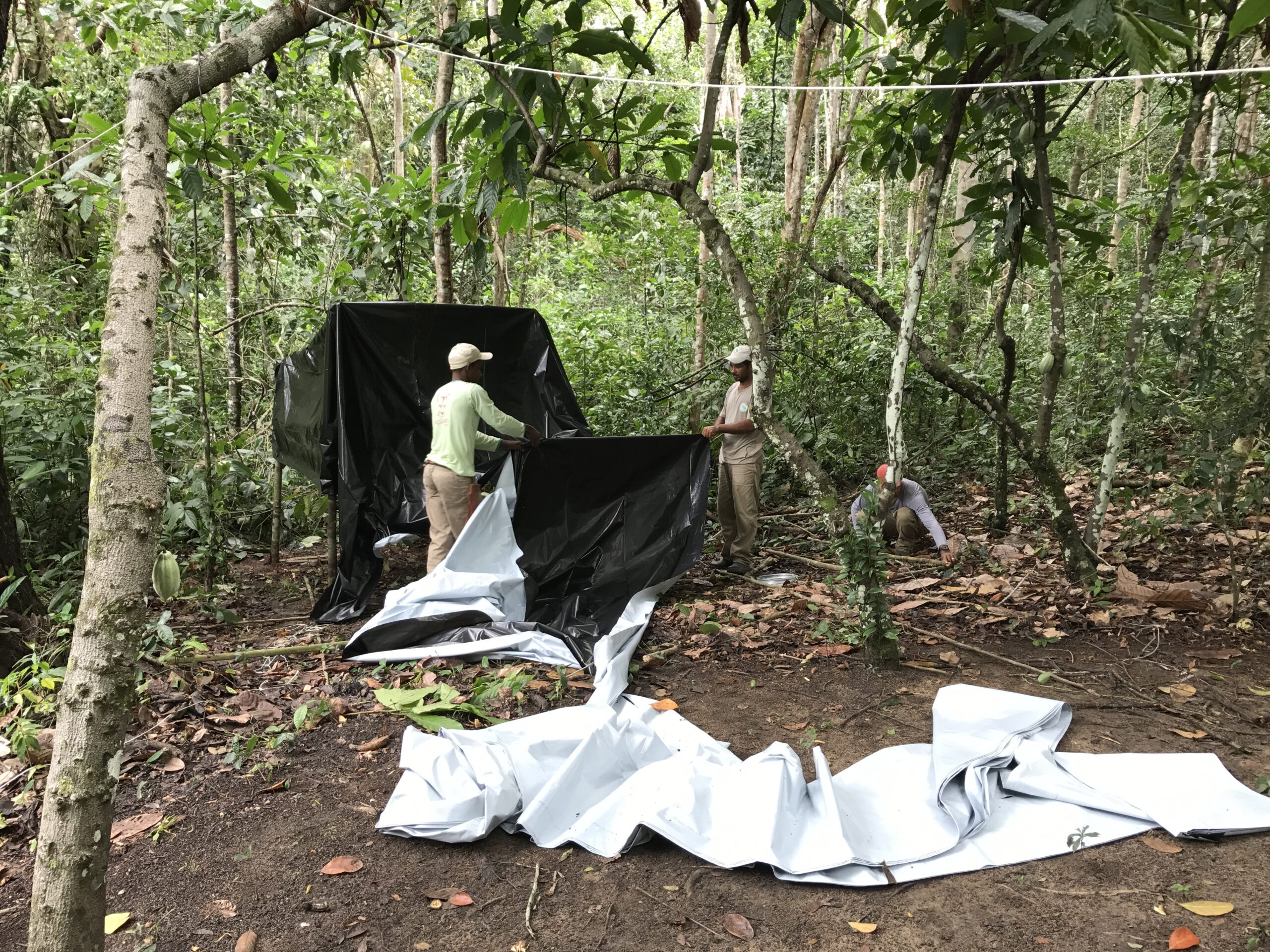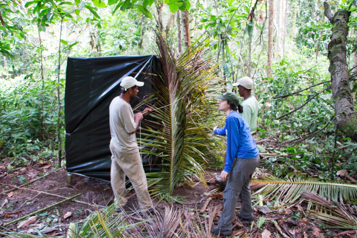 Durante la mia permanenza nella RPPN ho camminato senza sosta, accompagnata da valide ed esperte guide locali, sia nelle giornate torride, sia sotto ai temporali. Loro, con perizia e amore, mi hanno insegnato a distinguere i suoni della foresta e a fare attenzione ad ogni piccolo dettaglio. Con mia grande soddisfazione, ho imparato a memoria i percorsi, le scorciatoie e i passaggi segreti tra gli alberi. Ho trascorso anche tante ore in una capanna di foglie, costruita con maestria dai lavoratori della riserva, nell’unica area dove la canopy vegetale lasciava un po’ di spazio libero al passaggio dei raggi del sole. Lì avevamo collocato due gabbie automatiche, e all’interno di queste posizionavamo della frutta fresca e delle uova sode per attrarre gli individui. In silenzio, per non rivelare la nostra presenza, aspettavamo nella capanna che almeno uno di loro entrasse a mangiare, per poi catturarlo, apporre il radiocollare e poter seguire così il suo gruppo di appartenenza nei mesi successivi. Nei primi giorni sono rimasta all’interno del nascondiglio per 12 ore consecutive, insieme al dottor Tiago Falotico, sperando, invano, che la cattura avesse successo.