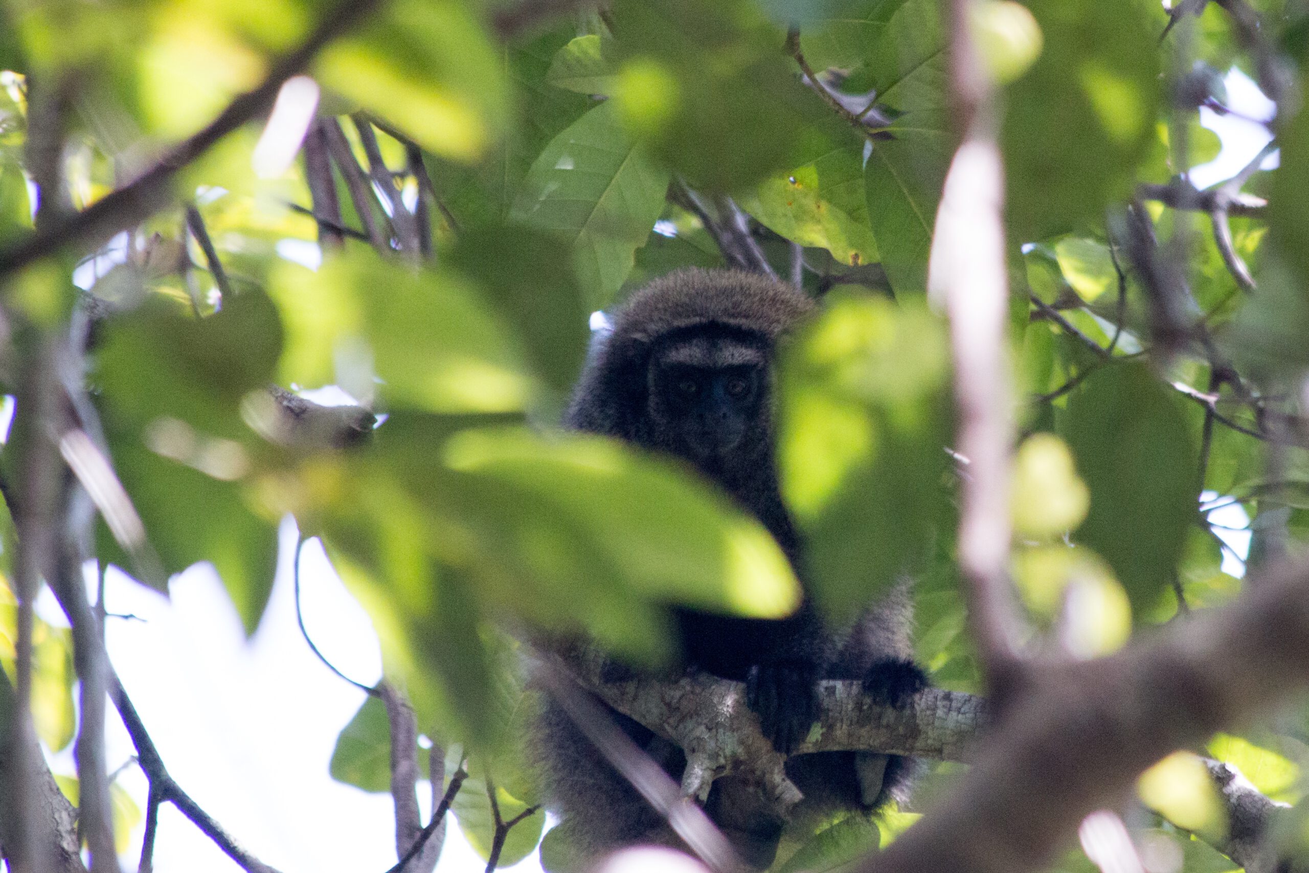 Quando, andando, escutávamos barulhos de pulos entre galhos, sabíamos que os macacos ficavam bastante perto de nós. Então, nos escondíamos imóveis e atentos atrás de uma árvore, esperando o momento certo para observar os animais no alto, gravar um vídeo ou tirar umas fotos. Cada vez, eu tinha que registrar o ponto GPS do encontro, ação importante para depois designar um mapa bastante preciso da área da espécie na reserva.